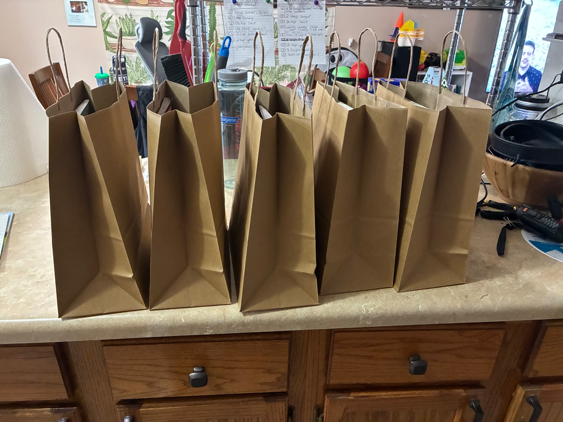 Gift/activity bags are ready! Each kid will get crayons, a tray to put them in, a coloring book and a rubber duck and rubber frog to color with.
